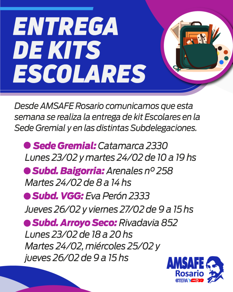 Desde AMSAFE Rosario comunicamos que esta semana se realiza la entrega de kit Escolares en la Sede Gremial y en las distintas Subdelegaciones. -Sede Gremial:[...]