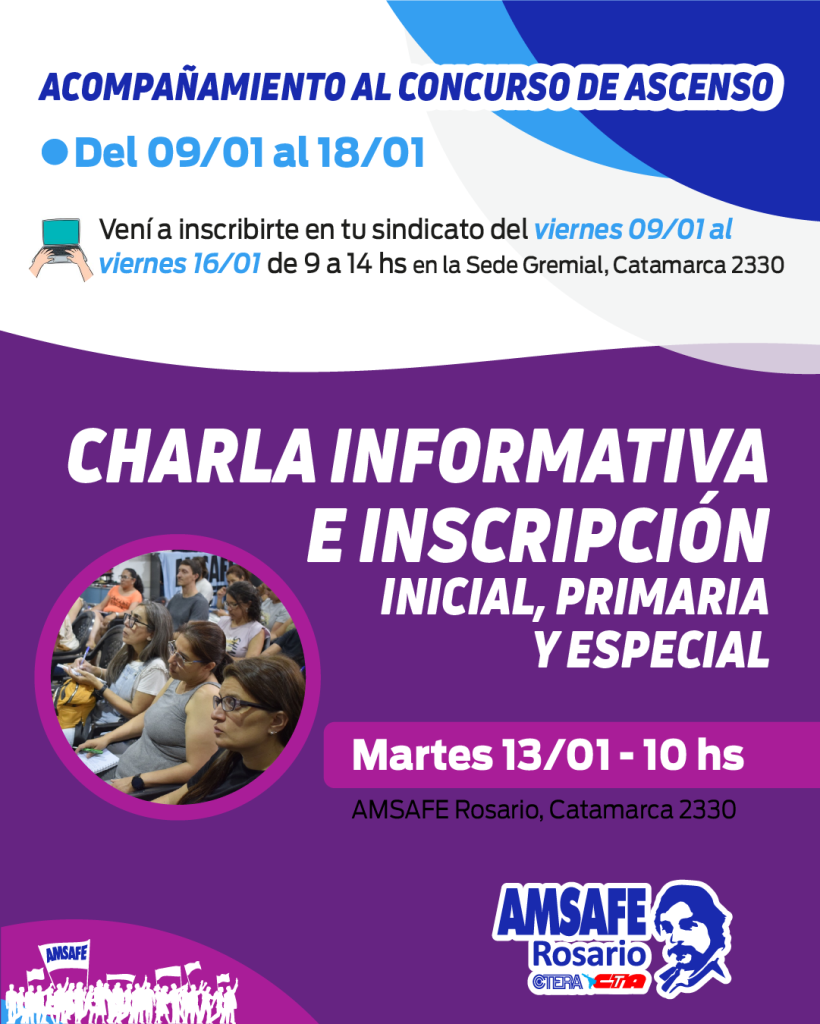Charla informativa e inscripción: Inicial, primaria y Especial: Martes 13/01 – 10 hs. AMSAFE Rosario, Catamarca 2330