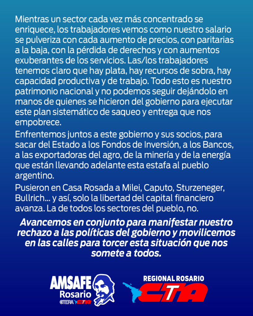 Mientras un sector cada vez más concentrado se enriquece, los trabajadores vemos como nuestro salario se pulveriza con cada aumento de precios, con paritarias a la baja, con la pérdida de derechos y con aumentos exuberantes de los servicios. Las/los trabajadores tenemos claro que hay plata, hay recursos de sobra, hay capacidad productiva y de trabajo. Todo esto es nuestro patrimonio nacional y no podemos seguir dejándolo en manos de quienes se hicieron del gobierno para ejecutar este plan sistemático de saqueo y entrega que nos empobrece.