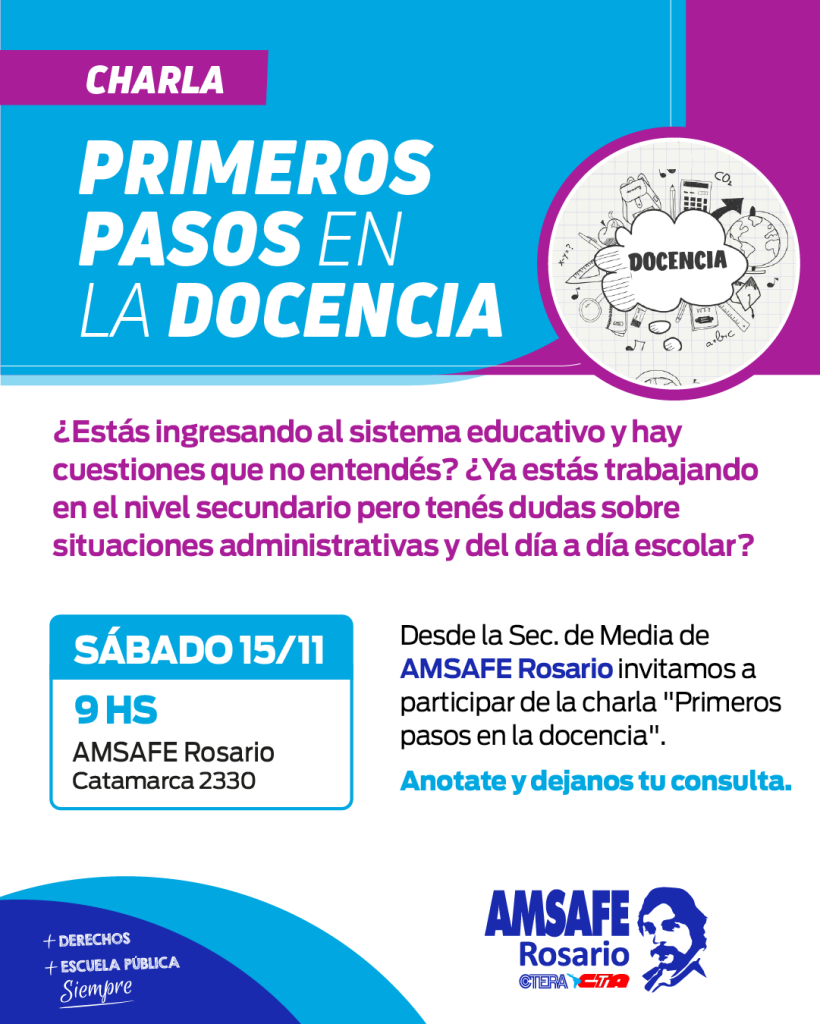 🔵 Desde la Sec. de Media de AMSAFE Rosario invitamos a participar de la charla “Primeros pasos en la docencia”, el día Sábado 15/11 a[...]