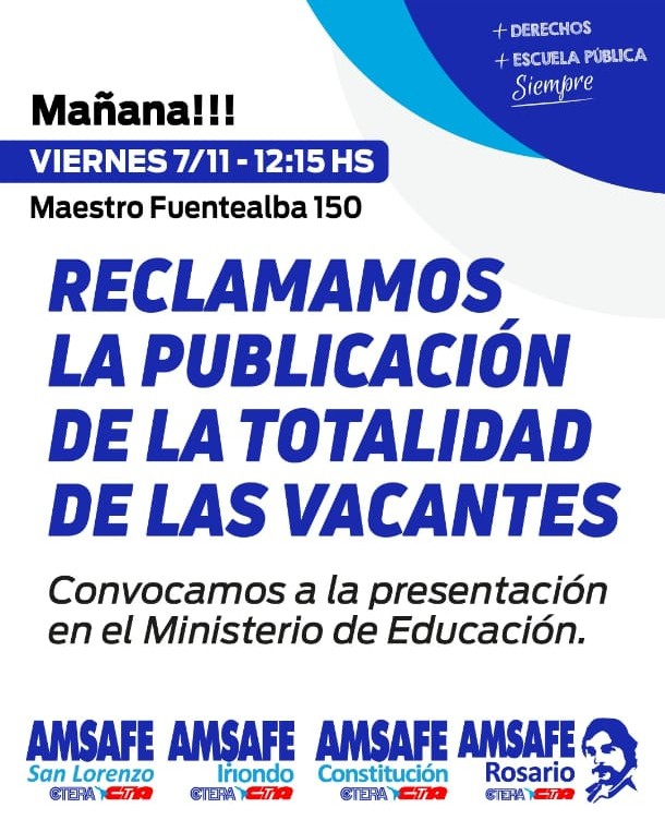 🔵 Este viernes 7/11 las seccionales Iriondo, San Lorenzo, Constitución y Rosario de AMSAFE presentamos ante la Regional N° 6 del Ministerio de Educación el[...]