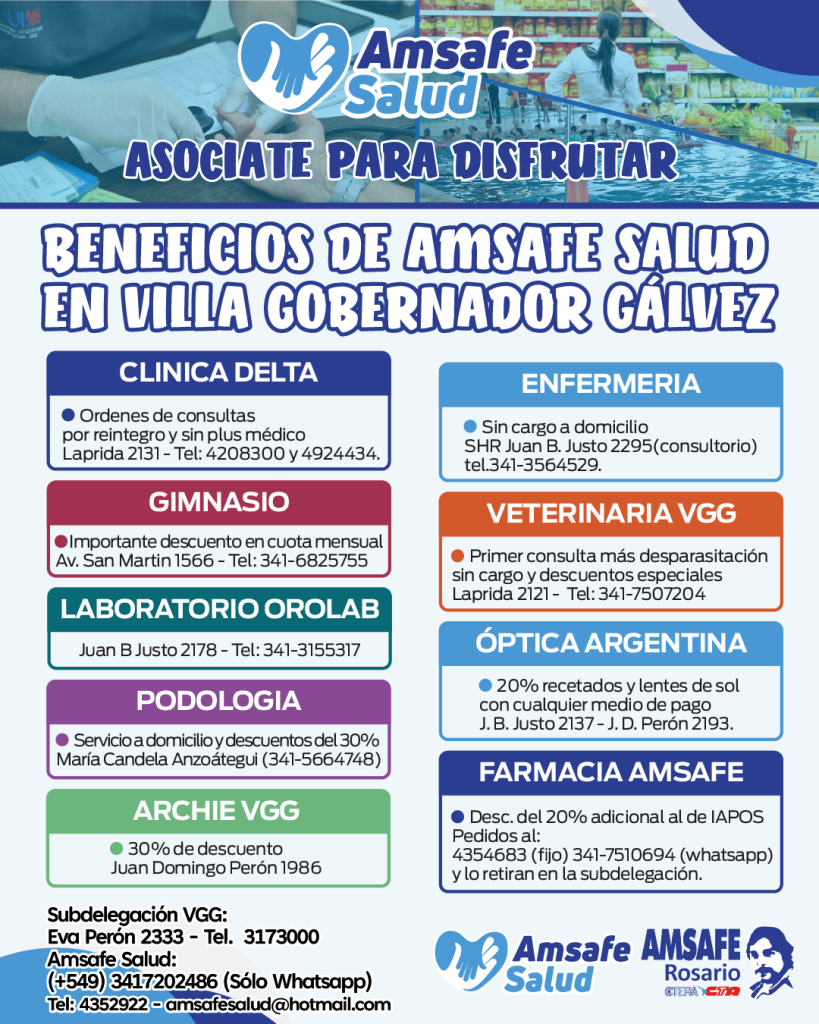 Asociate para disfrutar 🔵 FARMACIA AMSAFE Desc. del 20% adicional al de IAPOS. Pedidos al: 4354683 (fijo) 341-7510694 (whatsapp) y lo retiran en la subdelegación.[...]