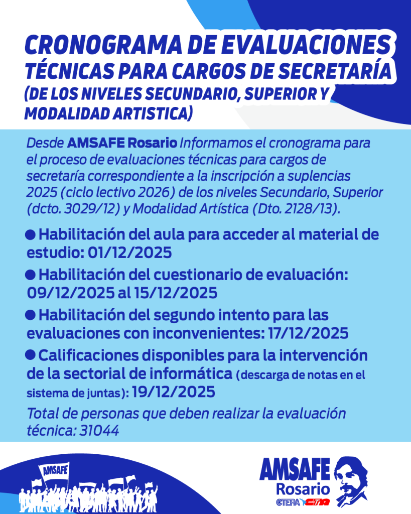 Desde AMSAFE Rosario Informamos el cronograma para el proceso de evaluaciones técnicas para cargos de secretaría correspondiente a la inscripción a suplencias 2025 (ciclo lectivo[...]